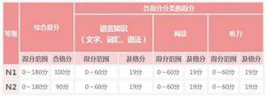 N1级别100分合格,满分180,且词汇语法、阅读、听力各项必须大于等于19分才算及格;词汇语法、阅读(110分钟)、听力(60分钟)