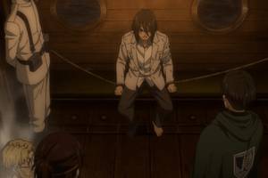 莱纳被击倒在地,皮克和阿妮变身巨人,与莱纳一起继续战斗。阿尔敏则不断向着艾伦喊叫,变成超大巨人的阿尔敏走向前来,身后一个爆破声,原来出现了长发的超大巨人艾伦,两个巨人开始互殴痛扁,拳拳到肉的场面分外激烈,然而阿尔敏不是艾伦的对手,被狠狠揍了一番。