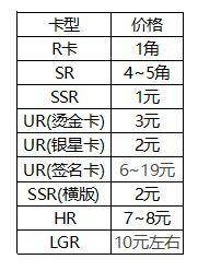 R卡:1角,SR:4~5角,SSR:1元,UR(烫金卡):3元,UR(银星卡):2元,UR(签名卡):6~19元,SSR(横版):2元,HR:7~8元,LGR:10元左右。