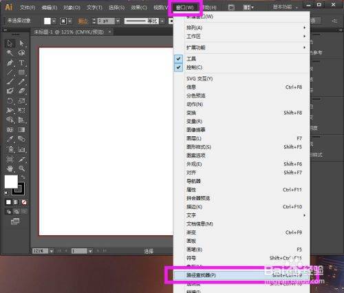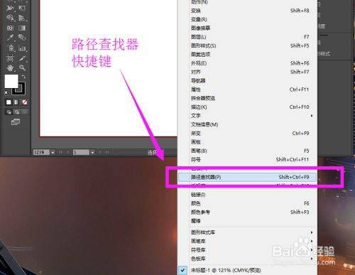 第三种方法也是我们最常使用到的,那就是使用路径查找器的快捷键。路径查找器的快捷键是“shift+Ctrl+F9”。如果我们忘记了,可以直接在窗口菜单中找到它的快捷键。