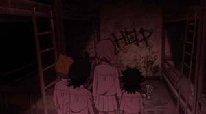 同时在第三集的内容,要比原来漫画内容更是营造出一种害怕、紧张的氛围。本来按照大叔的内容,这里是大叔跟艾玛一行人算是在上演租客和包租公的拉扯剧情。大叔不想艾玛他们在这里住,而艾玛他们非要在这里住。因此就展开拉锯战了,可动画里变成大叔不见,且在墙壁上留下“help”。这么匪夷所思的画面,让人觉得有些阴森森的。