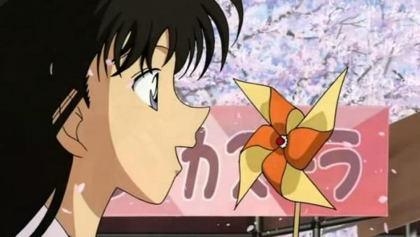 柯南,小兰与平次和叶一同去赏樱花;小兰拿了一个风车;把光顾着吃的“呆南”看傻了……