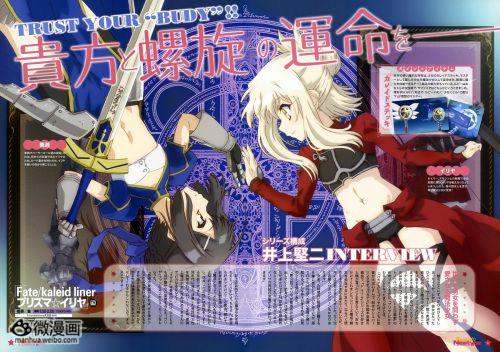 《Fate/kaleid liner 魔法少女☆伊莉雅》改编自日本漫画家广山弘作的Fate/stay night》的外传漫画故事围绕成为了魔法少女的伊莉雅展开故事。虽然人设风格和部分细节设定有别于原作,但作品的世界观以及既有角色的本质设定都基本以原作为基准[1]。在杂志《Comptiq》2012年4月号(3月9日发售)的广告页上,最先透露了《Fate/kaleid liner 魔法少女☆伊莉雅》的“动画化大决定”消息[2]。在《月刊Comp-Ace》2012年5月号(3月26日发售)的封面和卷首上,正发表了《Fate/kaleid liner 魔法少女☆伊莉雅》“动画化企划进行中!!”的消息[3]。电视动画的第1期于2013年7月12日开始播放,全10话。收录动画第11话的蓝光盘随漫画《Fate/kaleid liner 魔法少女☆伊莉雅 3rei!!》第4卷限定版同捆推出[4]。第2期动画《Fate/kaleid liner 魔法少女☆伊莉雅 2wei!》则于2014年7月9日开始播放。动作品主要围绕伊莉雅展开,就读穗群原学园的普通女生伊莉雅,在某天遇到了自称人工天然精灵的魔法露比万花筒之杖,并强制地被缔结契约,成为了魔法少女伊莉雅。此时已是红宝石之星持有人的她,也变成了万花筒之杖原持有者的魔术师远坂凛的奴隶,在其的命令之下,被迫帮忙回收阶级卡片。图中人物伊莉雅斯菲尔·冯·爱因兹贝伦(声优:门胁舞以)本作品的女主角,与原作设定不同,变成住在冬木非常普通的女孩子。有一天遇到了从凛手上逃出来的万花筒之杖,并被强制变成魔法少女。现成为红宝石之星的持有人,被红宝石之星的原主人凛强制要求帮其收回卡片。借由红宝石之星力量变身为魔法少女·Prisma伊莉雅。平常喜欢看魔法少女的动画DVD,所以愿望是成为魔法少女。就读穗群原学园小学部,兴趣是看动画。跑50米短跑总是不输给男生,但是却输给美游。对义兄卫宫士郎有着特殊的感情。在第二部时因小黑的出现,逐渐揭晓身份,其身份为爱因兹贝伦家为参与圣杯战争所使用的许愿仪,因母亲将魔力、记忆及知识封印,而成为普通的女孩子。在第三部来到美游所在的平行世界,与抓住美游的艾因兹华斯展开战斗。