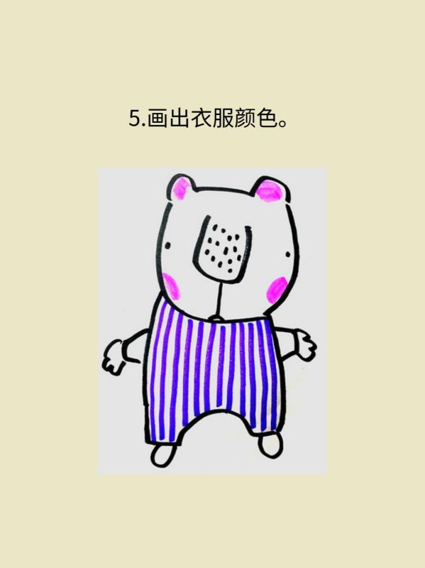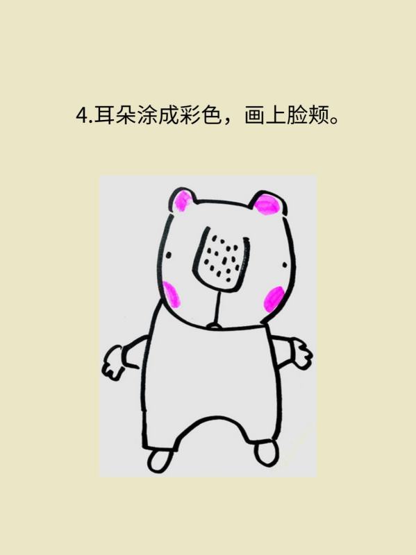 1、在小熊的耳朵里涂上棕色,画一个土棕色的腮红。2、把小熊的衣服涂上蓝色。3、再在小熊的耳朵外缘和脸上涂上土黄色,手和脚也涂上土黄色就完成了。