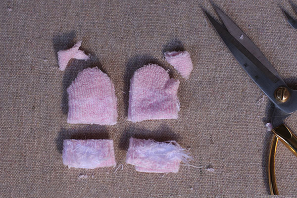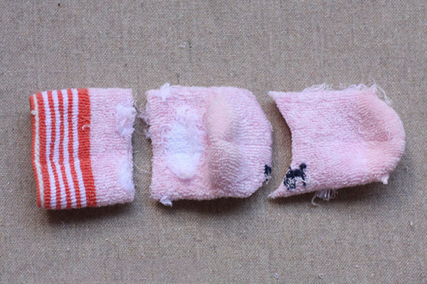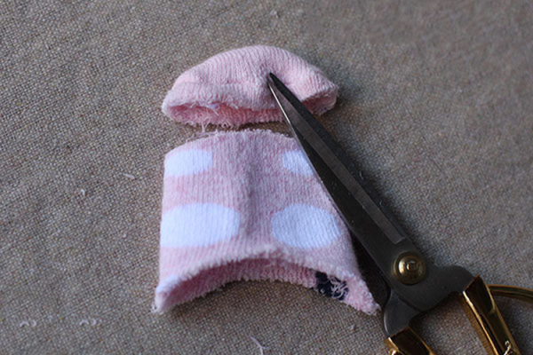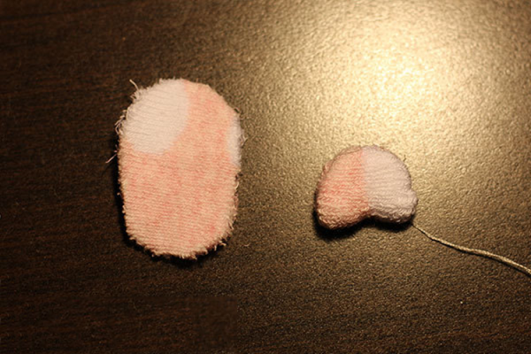 Step.16耳朵的做法:把剩余的袜子剪2片椭圆形,如图左边部分所示。然后对折,把它缝密,如图右边部分所示。