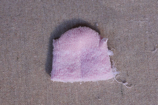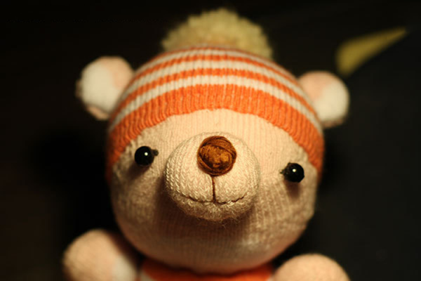 Step.15把另外一只袜子的横条部分剪下来,为小熊做一顶帽子。把袜子横条部分套在小熊头上适当的位置。帽子边缘部分用针线跟头部缝合好。帽子顶部用线缝纫,束紧后打结。
