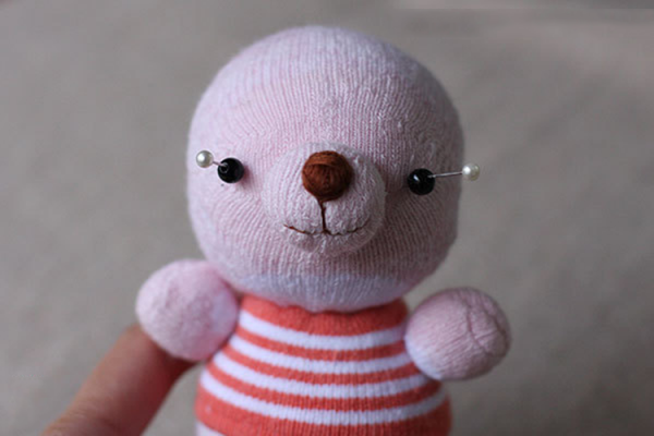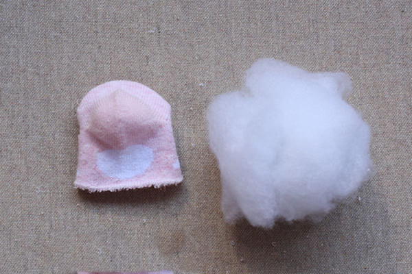 Step.14接下来做鼻子,把袜子顶部圆弧型的部分剪下来。用剪下来的部分做鼻子。剪下来后,把它修剪成圆形。(上图还没修剪成圆形)塞入纤维棉,把鼻子缝在脸上,再秀上鼻子跟嘴巴。用珠针固定好眼睛的位置后,再用针线缝好。