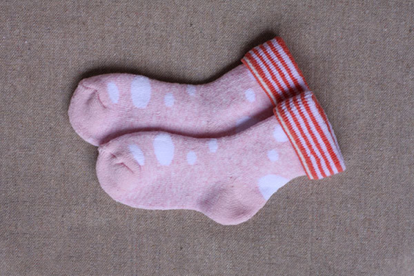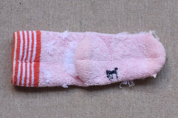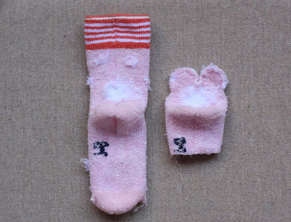 Step.9身体制作:拿出其中一只袜子,反转,剪成上图所示右边部分的形状。