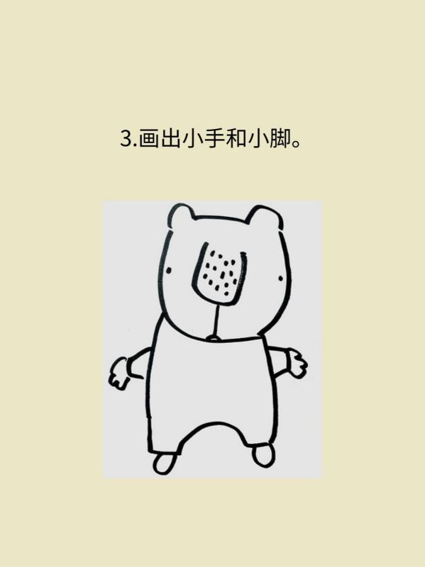 第四步:接下来画出熊的四肢,熊的前肢(上半身的手手)可以画出抱着肚子的样子,后肢可以画出向外的样子,也是根据自己的喜好,来画熊的姿势哦。再画出熊的爪爪。