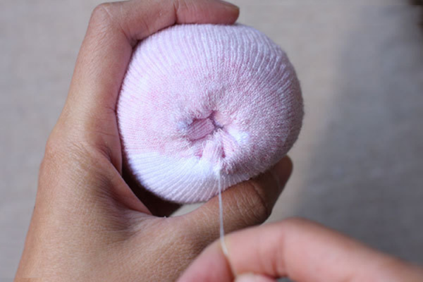 Step.4用线把弧形的部分缝好,缝好后,塞上纤维棉,塞棉的时候注意把棉弄均匀。用平针在开口周围缝一圈。把线向上口部分的袜子往里塞。