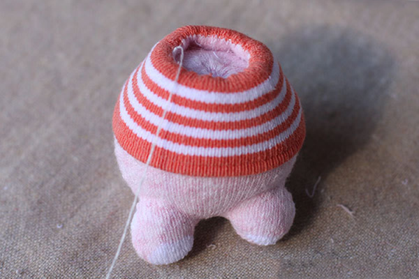 Step.12把横条部分套在身体上,留出身体1/3部分,这样更显可爱。在“衣服”顶部缝上一圈,再把多余的部分剪掉一些。把线收紧一点,不用全部束紧。再把多出的袜子部分往里塞。