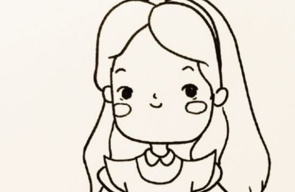 3、继续补充头发的细节,在头顶的位置有一个发箍,我们给爱丽丝画上五官,她的眼睛小小的,鼻子小小的,嘴巴也是小小的,在脸颊的两边画上两个晒红。