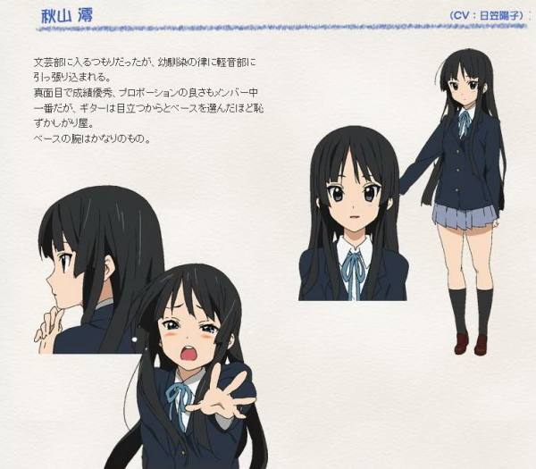轻音部的电贝斯手及合唱(有时也会担任主唱)。是一个左撇子,丹凤眼,有着到腰长度的黑发。是轻音部中唯一有后援会的部员。