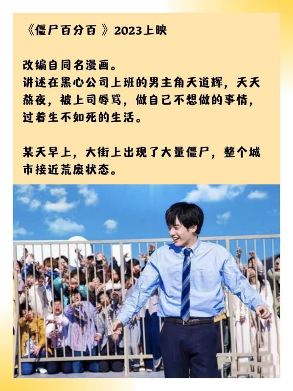 僵尸百分百动漫2023年出。由知名漫画家高田康太郎创作的末日题材漫画僵尸百分百宣布将制作真人电影,主演为赤楚卫二与麻生羽吕。