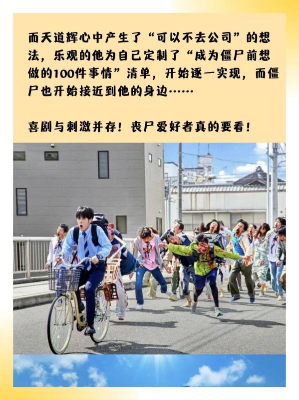赤楚卫二饰演的主人公天道辉在黑心企业上班三年,不仅连日加班还要遭受上司职权骚扰,因为糟糕的工作心力憔悴,过着生不如死的日子,一天早上僵尸淹没了整个城市,不必去上班的他在家逐一实施“变成僵尸之前想做的100件事”,包括大扫除、阳台露营等。