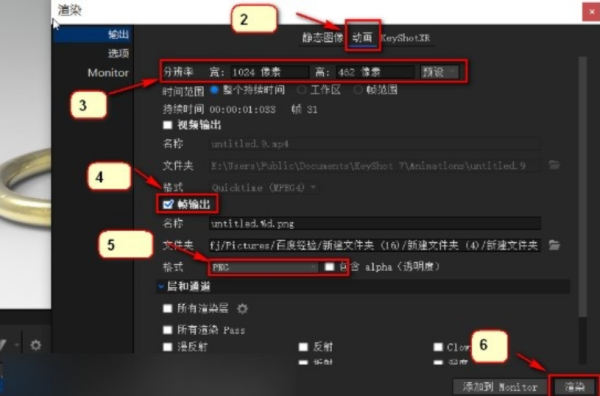 5.完成动画设置之后,在界面的右下角点击渲染按钮,在打开的渲染界面中切换到动画选项卡,渲染导出动画文件即可,可以选择输出的格式为PNG格式。