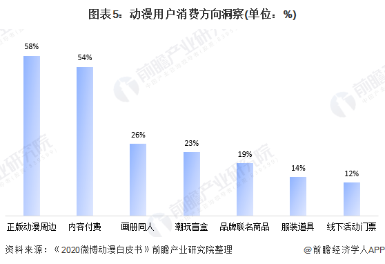 在相关商品的消费上,正版动漫周边和内容付费更受欢迎,分别有58%和56%的动漫用户其主要消费内容为正版动漫周边和内容付费。
