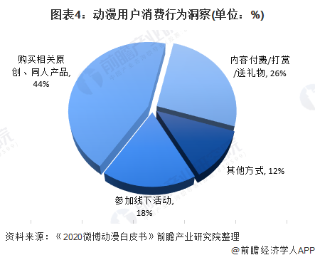 总体来说,我国动漫用户具有较强的消费意愿,其消费行为主要是购买相关原创、同人产品(44%),内容付费/打赏/送礼物(26%)和参加线下活动(18%)。