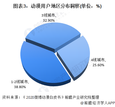 从地区分布来看,动漫用户地区下沉明显,1-2线城市的用户量仅占38.80%,其中,3线城市用户占比增长明显,较2019年增长了20.30%。