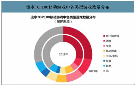 从2019年流水TOP100移动游戏各IP类型游戏流水分布来看,客户端游戏IP仍为移动游戏主要的IP来源。虽然流水占比持续提升,但随着IP库存的进一步消耗,TOP100产品中客户端游戏IP改编移动游戏产品的数量占比略有下降。其他类型IP如动漫、文学在数量上出现了较大幅度提升,IP来源呈现多元化局面,这也利好IP改编移动游戏市场的发展。