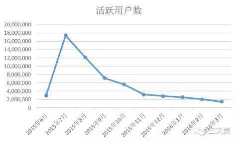 据天象公开文件披露,花千骨手游在上线后用户数迅速上涨,与8月份达到峰值(17,421,700人),随着电视剧播放完毕,活跃用户数逐渐回落,在10月后增长速度放缓,在2016年3月,该游戏的活跃用户数维持在2,000,000 人左右。