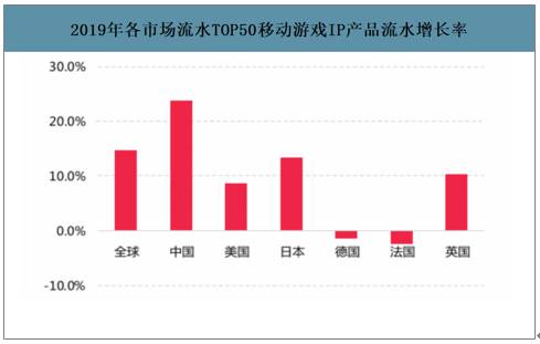 2019年各市场流水TOP50移动游戏IP产品流水增长率