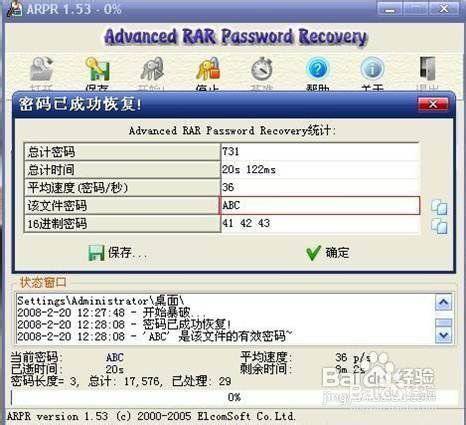 密码成功分析出来了,如下图:红色框内的就是密码ABC,这是比较简单的密码,分析时间很短,如果大家的文件密码忘记了,但是长度不止3位数,那么就修改密码长度和爆破选项范围就可以了。