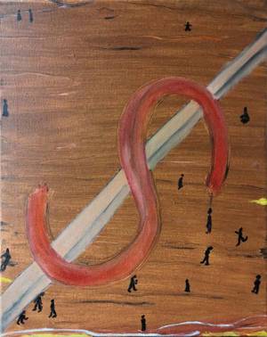 5、灵遁者油画作品《金钱与人》。尺寸:40×50cm