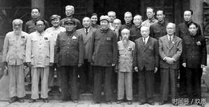 1949年7月5日,毛泽东和新政治协商会议筹备会常务委员合影。一排左起,谭平山、章伯钧、朱德、毛泽东、沈钧儒、李济深、陈嘉庚、沈雁冰;二排左起,黄炎培、马寅初、陈叔通、郭沫若、蔡廷锴、乌兰夫;三排左起,周恩来、林伯渠、蔡畅、张奚若、马叙伦、李立三。