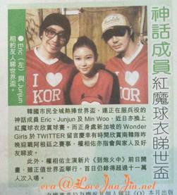 韩国市民全城热捧世界杯,连正在服兵役的神话成员Eric、Junjin及MinWoo,近日亦换上红魔球衣欣赏球赛。而正身处新加坡的WonderGirls於TWITTER留言庆幸有时间欣赏南韩队昨晚迎战阿根廷之赛事,权相佑亦指会与家人及好友睇波。