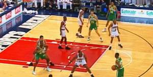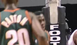 抛去那些暴力的部分,也有很多相对细腻的小技术。比如坎普有一些面框,在暴力扣篮的前奏里,坎普的突破动作看起来很顺滑。拿格里芬跟坎普比的比较多,比起格里芬来说,坎普手长脚长,看起来更精瘦,动作完成也更顺畅。比如如下几个动图的突破扣篮。