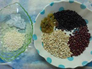 1、冰糖,糯米,红豆,薏米,黑米,葡萄干。