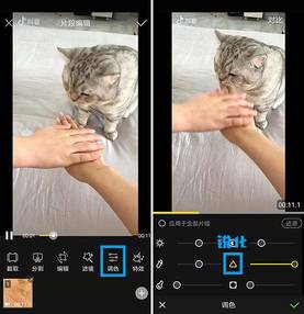 2、用抖音APP正常做视频,这一步的过程我们就生过去,需要特别注意的是最后需要在“片段编辑”里面,选择“调色”,里面的锐化,提高20-70%都是可以的,这个根据实际情况调整。