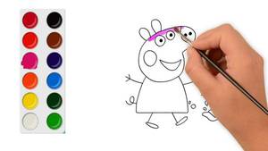 之后在这个的头下画一个三角形代表裙子。在三角形两侧画两道和1.5个3,这样看起来像是小猪佩奇的手。在三角形下边写两个数字1,加上两个小半圆形,小猪佩奇的腿就完成。最终,小猪佩奇的手上拿着冰激凌,并为它着色。