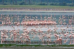 恩戈罗恩戈罗火山口自然保护区是各类鸟类越冬的必经之地,数以千计的粉红色火烈鸟聚集在火山口湖面,深蓝色宁静湖水,粉色羽毛相互交错,天上云来云往,宛如一幅绚丽画卷。火山口周围花卉种类繁多,薰衣草,牵牛花,野雏菊,百合花争先绽放,汇成一片花海,动物带着幼崽动物悠然穿行其中,点缀火山口,惊叹自然之美,令人动容。由于东非雨量充沛,森林里树木都粗茎大叶,地上更是灌木丛生,带刺的阿拉伯洋槐随处可见。