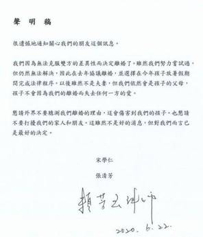 习惯被照顾,习惯身边有张清芳的宋学仁开始慌乱了。2020年5月份,宋学仁高调送豪宅给张清芳,希望能打消她离婚的念头。却没想到,在婚姻里痛苦挣扎了15年的张清芳,已经深思熟虑的想好了决定。离婚,势在必行,却没想到被媒体报出来,只能提前实行计划了。2020年6月22日,张清芳发表声明,和宋学仁正式离婚了。