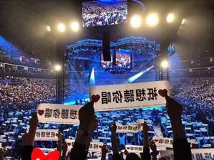 说这话的时候,张学友身后的热情粉丝举着荧光板,上边写着:“用余生爱你。”