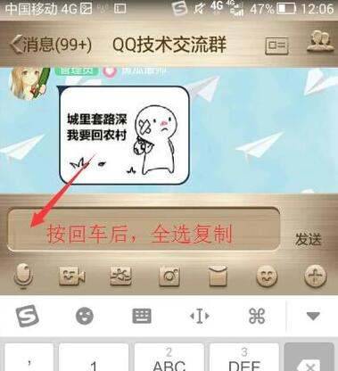 3:进入聊天页面,将第二步的代码复制下来,按回车,继续复制刚刚按过回车的代码,把这个代码复制到口令就可以了