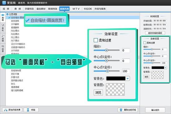除了去水印,还有一种方法,即裁剪掉带水印的区域。按之前方法导入视频,然后选择“画面风格”-“画面”-“自由缩放(画面裁剪)”,通过中部区域“缩放”拉杆,调整裁剪区域即可。