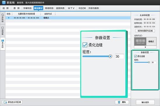 在中部“参数设置”区域,勾选“柔化边缘”,将“程度”拉杆拉到最大。这样去水印效果不会那么生硬。