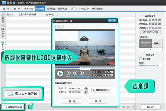 打开 爱剪辑,将要去水印的视频拖曳到“视频”选项卡,然后点击“叠加素材”-“去水印”,框选需要去水印的区域。