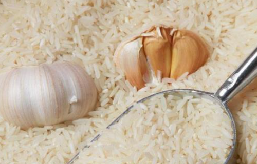 选用几块新鲜、完好的蒜头,剥去外壳,然后在用透气的布袋装好封住,分几个小袋放入米袋中即可。