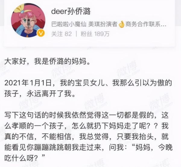 3、2021年1月2日,据新浪娱乐报道,孙侨潞妈妈发文证实孙侨潞去世消息,年仅25岁。