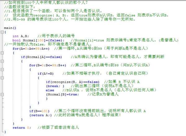 因为如果B不认识A,A就肯定不是名人,直接排除,B如果认识A,B就不是名人,也排除。所以只要不重复的问,最少99次最多198次就能问出名人。