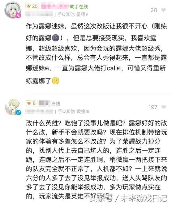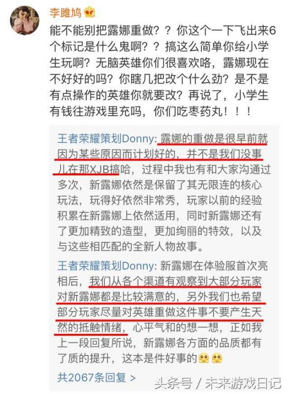 《王者荣耀》在上一次更新中正式将露娜重做版放出,这一举动引起了玩家们的不满,露娜作为非常有代表性的高操作英雄,喜爱露娜的玩家需要花比较长的时间去掌握她,这一改意味着玩家就需要重新去熟悉她,而且露娜和别的重做英雄不同目前也并不算弱,技能也没有不妥之处,这次重做确实显得突兀,玩家不能接受也是理所当然。