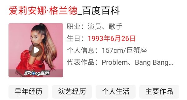 (Ariana Grande),1993年6月26日出生于美国佛罗里达州伯克莱屯市,美国女歌手、演员。