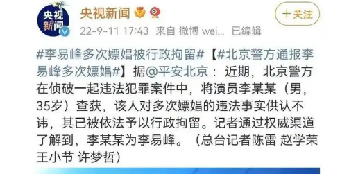 9月11日下午,北京警方发布通报称,35岁演员李某某多次嫖娼被行政拘留。据人民日报消息,该名演员为李易峰。