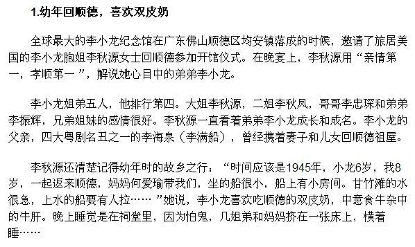 关于李小龙祖籍何处,祖居又在何处,历来众说纷纷,近年来,顺德市政府办公室经过两年多的考证,终于揭开历史之谜——李小龙的祖籍和祖居均在广东省顺德市均安镇上村乡。