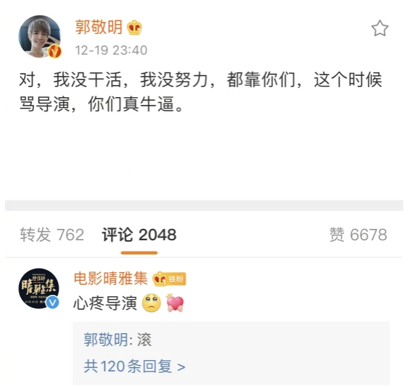 《晴雅集》的官方微博在下面留言“心疼导演”,也被他用了一个“滚”字怼了回去。可以看出郭敬明当时是有多崩溃,连自己团队的人都怼。不过他的这种操作却给影片做了很好的宣传,不管是好事还是坏事,《晴雅集》电影都因此频频被送上热搜。现在影片马上就要上映了,希望能有一个满意的票房,也能让郭敬明导演的压力减少点。