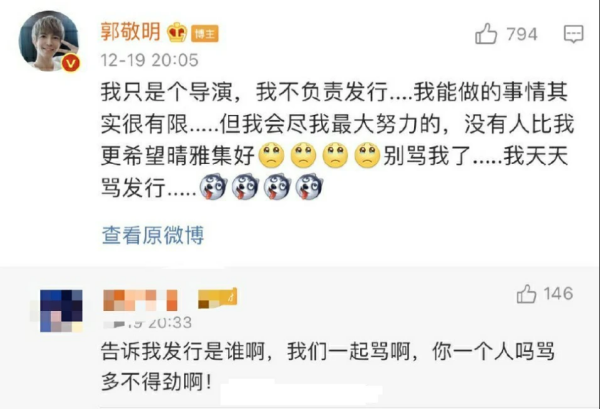 但是,还有很多人觉得电影的宣传力度不行,电影不仅没有杜比影院,连排片时间和场次都不是很理想,都在郭敬明的微博下吐槽他。让郭敬明也非常无奈,在微博上表示“我只是个导演,不负责发行,大家不要天天骂我了,去骂发行吧”粉丝们显然不认同他的说法,一直在评论里攻击他。最后气的郭敬明在微博上说“我没干活,我没努力,都靠你们,这个时候骂导演,你们真牛逼!”一看就是心态崩了。